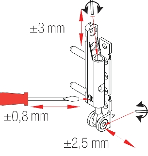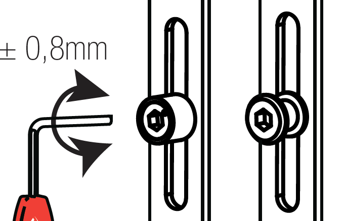 Alt menteşe ve üst menteşe üzerinden allen anahtar yardımı ile sağa sola doğru ayarlanma sağlanabilir.